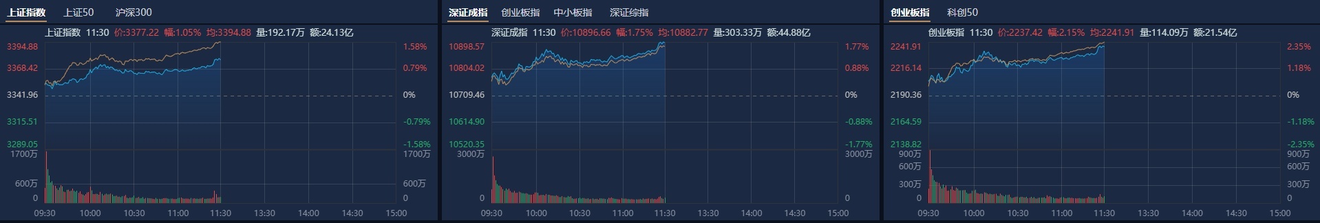 市场早盘高开高走配资安全正规平台,创业板指领涨。南财金融终端显示,截至早盘收盘,沪指涨1.05%,深成指涨1.75%,创业板指涨2.15%。