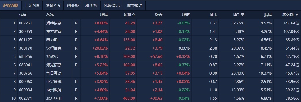 沪深两市半日成交额1.17万亿元,较上个交易日放量2237亿元。个股方面,南财金融终端显示,拓维信息成交额超147亿元居首,东方财富、赛力斯、汉得信息成交额靠前。