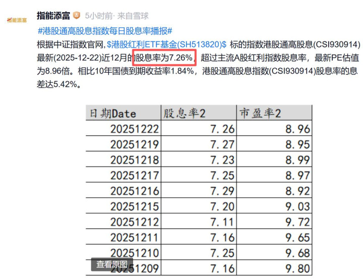 根据“指能添富”的数据:目前港股通高股息指数的股息率为7.26%,较一个月前的6.5%有不少提升!