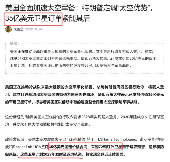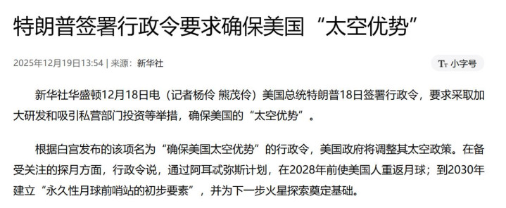 1、川普12月18日签署行政令,要求采取加大研发和吸引私营部门投资等举措,确保美国的“太空优势”。