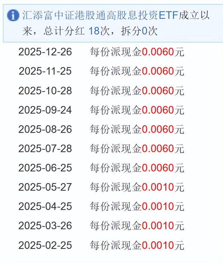 跟踪该指数的标的中,规模最大的是港股红利ETF基金(513820),目前已经超40亿规模。最关键的是,513820持续每月现金分红,是所有港股红利类ETF中分红次数最多的。